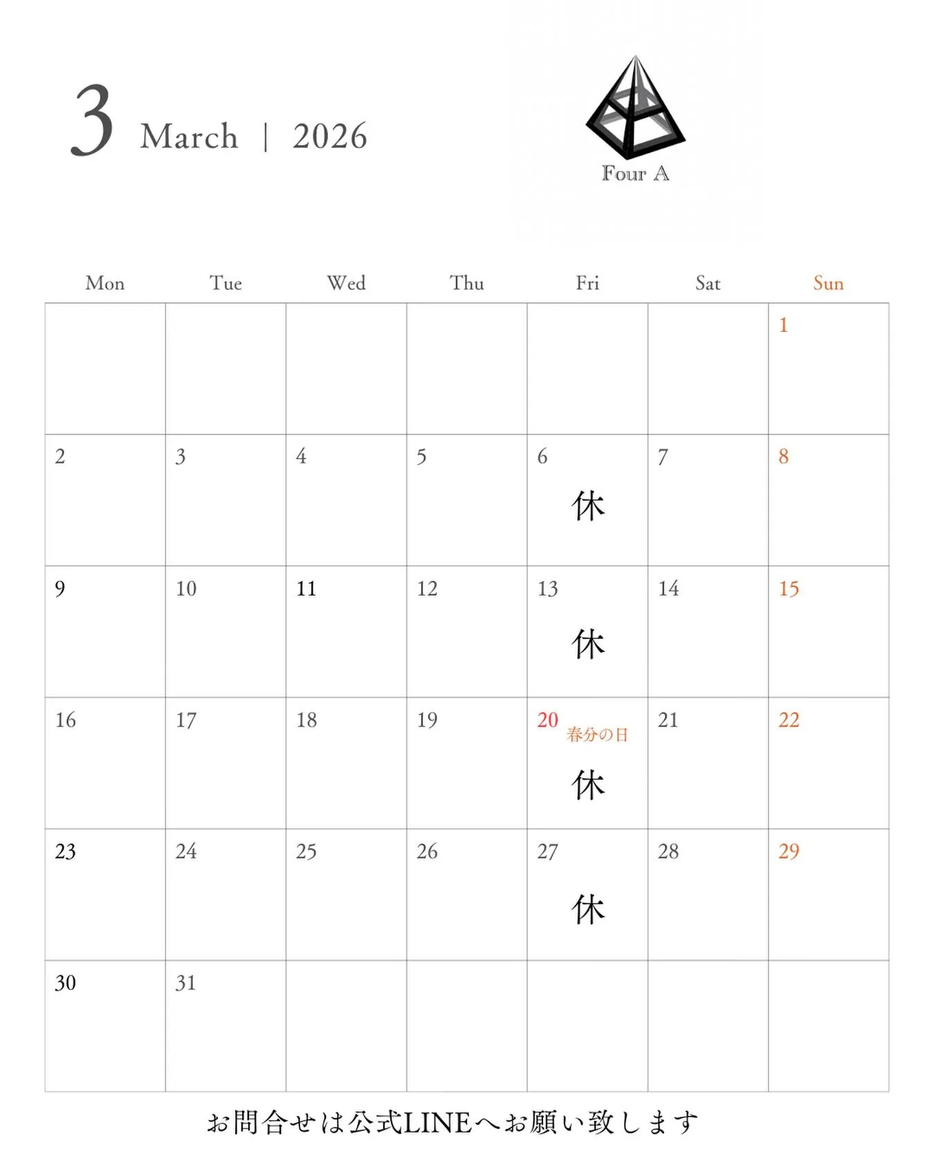 3月の定休日のお知らせです- ̗̀📢 3月の定休日のお知らせです-̗̀📢来月より、定休日を水曜日→金曜日に変更させて頂きます!⚠️公式LINEでもアナウンスさせて頂きます!😇よろしくお願い致します😎😎#FourA#定休日案内#定休日変更のお知らせ当店…